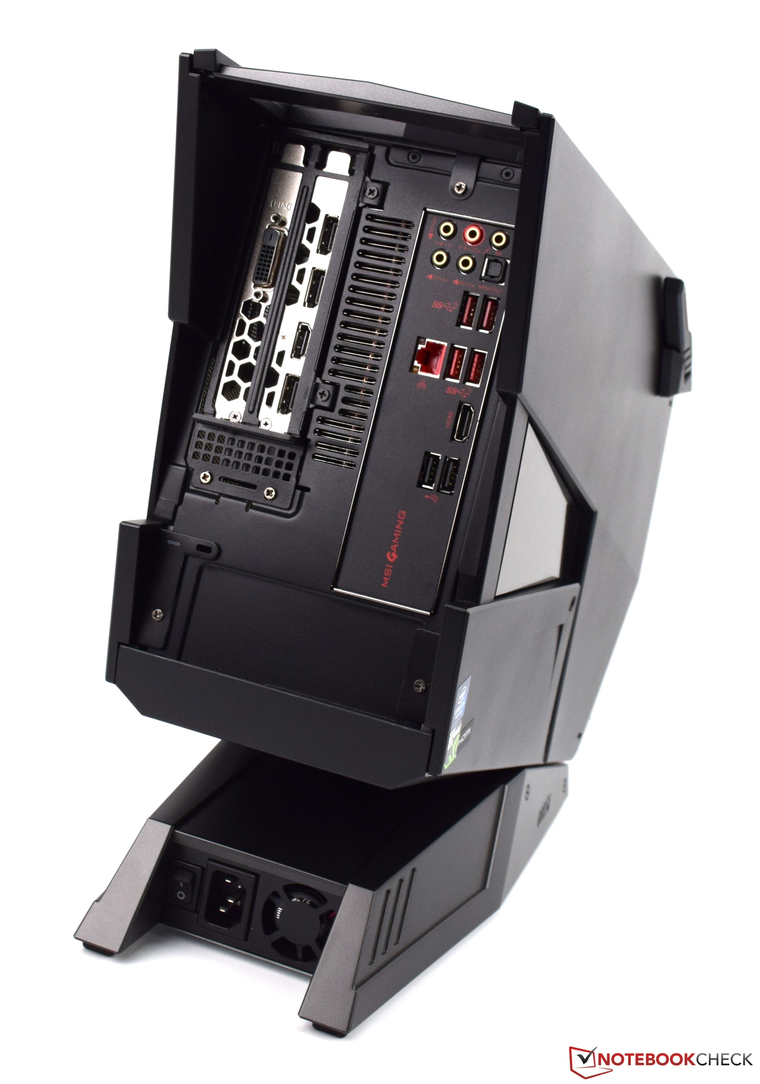 Das Gehäuse des MSI Aegis 3 8RD ist keines von der Stange. Etwas extravagant wirkt es dennoch, denn mit der schrägen Optik zieht der MSI Gaming-PC die Blicke auf sich. Im unteren Teil, dem Standfuß, befindet sich das Netzteil, dieses sorgt für etwas Gewicht in diesem Bereich.