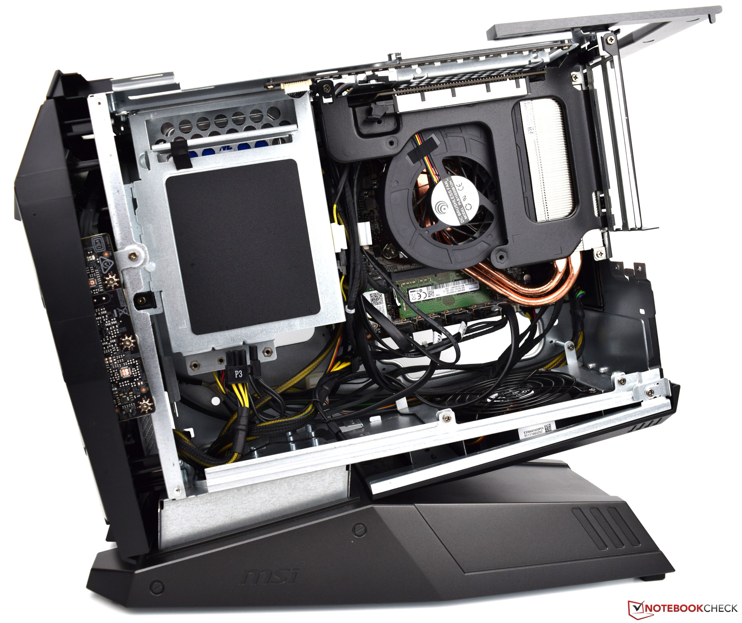 Für Wartungs- oder Aufrüstarbeiten kann das Gerät problemlos geöffnet werden. Die beiden Seitenteile und der Deckel sind mit Schrauben fixiert und lassen sich schnell demontieren. Danach gelangt man mehr oder weniger gut an die verbauten Komponenten. Die Grafikkarte lässt sich ebenfalls schnell ausbauen und gegebenenfalls austauschen. Hierbei sollte allerdings die maximale Leistungsaufnahme nicht außer Acht gelassen werden, denn das Netzteil liefert nur maximal 450 Watt. Der Arbeitsspeicher hat die Besonderheit, dass MSI hier auf SO-DIMM-Module setzt, welche vorrangig in Notebooks verbaut werden. Die SO-DIMM-Arbeitsspeicher sind jedoch platzsparender und somit in diesem Fall besser geeignet, als die herkömmlichen RAM-Module. Beim Massenspeicher kann der Nutzer den MSI Aegis 3 8RD problemlos noch mit zwei zusätzlichen Speichermedien versehen. Ein 3,5-Zoll-Schacht und ein 2,5-Zoll-Einbauschacht sind noch vorhanden und bereits verkabelt.