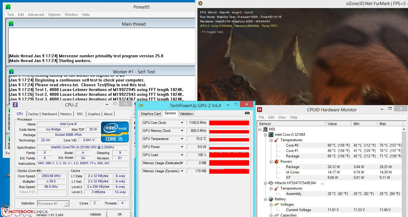 Den Stresstest (Prime 95 und Furmark arbeiten mindestens eine Stunde lang) bearbeiten CPU und GPU im Netzbetrieb mit der vollen Geschwindigkeit (2,9 GHz bzw. 1.100 MHz). Den Stresstest absolviert die CPU im Akkubetrieb ebenfalls mit 2,9 GHz. Die GPU hingegen wird auf 650 MHz gedrosselt. Bei Bedarf könnte man im Menü des Intel-Treibers die Drosselung deaktivieren. Die CPU-Temperatur hat sich im Netzbetrieb bei 69/70 Grad Celsius eingependelt.