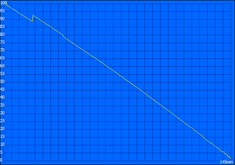 Der DVD-Test ermittelt eine sehr ähnliche Zeit. Nach 2:38 Stunden (158 Minuten) geht der Film aus, den wir mit einer geringen Helligkeit von 100 cd/m² angesehen haben. Bis er fortgesetzt werden kann, vergehen 2:27 Stunden. Solange braucht der Akku für die vollständige Ladung nach restloser Entleerung.
