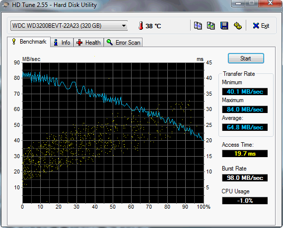 Die Western Digital Festplatte (Typ WD3200BEVT) mit einer Bruttokapazität von 320 GByte hat nur durchschnittliche Übertragungsraten von 65 MB/s (sequentielles Lesen). Aktuelle Notebook-Festplatten, ebenfalls mit 5.400 rpm, erreichen ebenso 60 bis 70 MB/s. Relativ hoch fällt die Burst Rate von 98 MB/s aus. Dieser Wert beschreibt das Datenvolumen, das binnen einer Sekunde aus dem Cache der HDD geholt werden kann. Die Western Digital HDD ist im Betrieb nur durch ein leises Rauschen zu hören, die Lese-Schreibköpfe erzeugen lediglich sporadisch ein dezent klackerndes Geräusch.