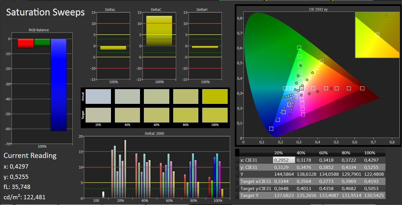 Im Auslieferungszustand haben wir den Bildschirm vermessen (Zielfarbraum sRGB) und konnten dabei deutliche DeltaE-2000-Abweichungen bei den meisten Farben feststellen. Am stärksten weichen Blautöne und die Graustufen ab. Nur die Farben Gelb und Gelbgrün liegen im Zielbereich (DeltaE kleiner 5). Das Display besitzt einen Blaustich.