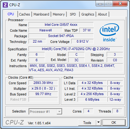 Im Inneren des CX70 steckt ein Core i7-4702MQ der Firma Intel. Dieser Haswell Vierkerner arbeitet mit einer Basisgeschwindigkeit von 2,2 GHz. Per Turbo kann die Geschwindigkeit auf 2,9 GHz (alle vier Kerne), 3,1 GHz (2 Kerne) und 3,2 GHz (nur ein Kern) erhöht werden. Die Rechenergebnisse des Prozessors sollten um etwa 10 Prozent höher ausfallen als bei seinem gleich getakteten Ivy-Bridge-Vorgänger, dem Core i7-3632QM. Intel beziffert die TDP des Core i7-4702MQ mit 37 Watt. Damit liegt sie um zwei Watt höher als beim Vorgänger.