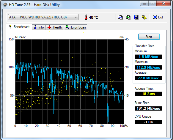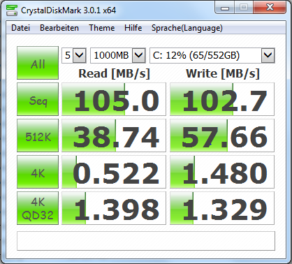 Die verbaute Festplatte aus dem Hause Western Digital bietet mit einer Kapazität von 1 TB viel Speicherplatz für Anwendungen und persönliche Daten. Sie arbeitet mit 5.400 Umdrehungen pro Minute. Die Platte ist in eine Betriebssystempartition (551 GB) und eine Datenpartition (367 GB) unterteilt. CrystalDiskMark meldet eine Lesegeschwindigkeit von 105 MB/s. HD Tune liefert eine durchschnittliche Transferrate von 77,8 MB/s. Diese Werte gehen in Ordnung, sind aber nicht überragend. Dagegen fallen die Werte in den 4k-read- und 4k-write-Tests ungewöhnlich gut aus für eine herkömmliche Festplatte. Viele vergleichbare Festplatten liefern deutlich schlechtere Werte. Die 4k-read-/write-Übertragungsraten sind wichtig, da die meisten Daten in Blöcken mit eine Größe von 4 kb abgelegt werden. Mit einer Solid State Disk können herkömmliche Festplatten allerdings nicht mithalten.
