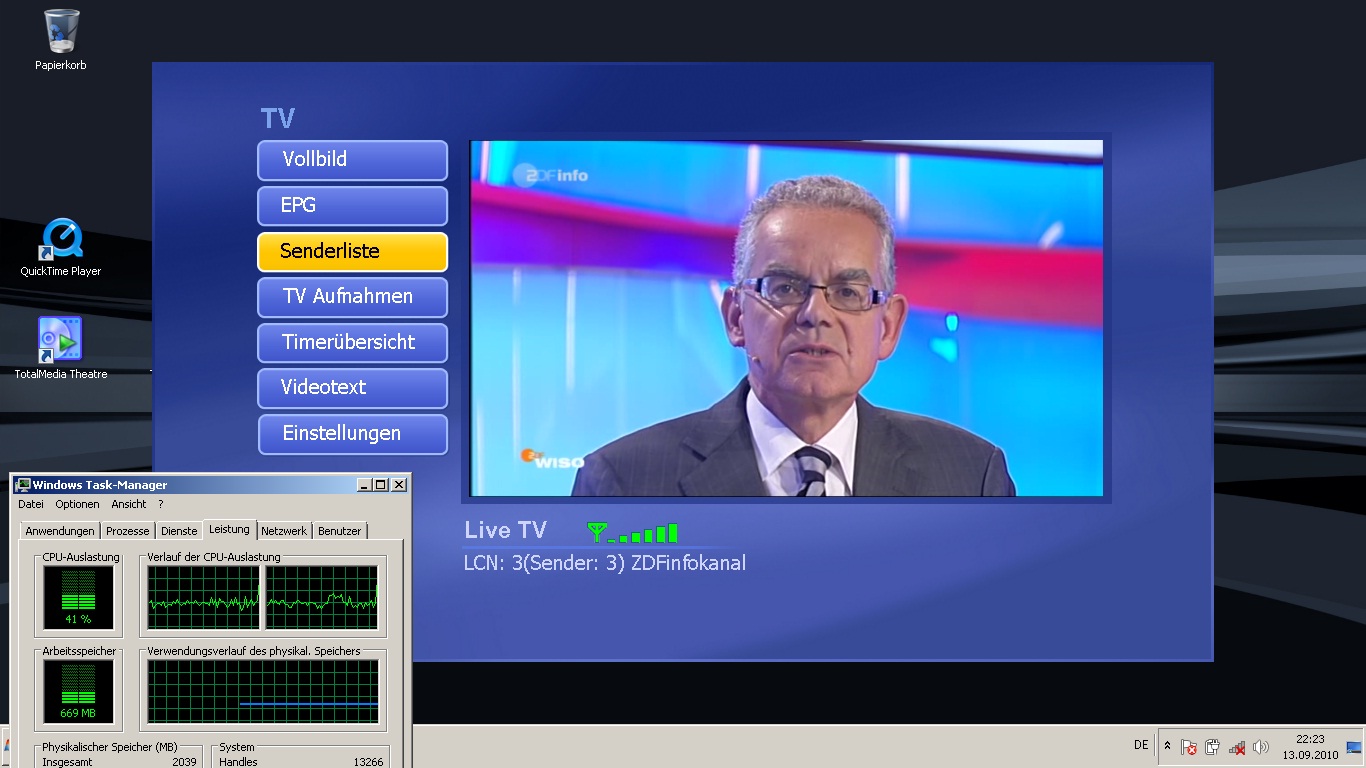 Die Bedienoberfläche gleicht der eines Mediacenters und beinhaltet auch viele entsprechende Elemente, wie Schaltflächen für den Zugriff auf Fotos, DVDs usw. Nach einigen Konfigurationseinstellungen und dem notwendigen Sendersuchlauf kann man sofort in den TV-Betrieb einsteigen und wird mit einer guten Empfangsleistung belohnt. Das TV-Bild erscheint zunächst von der blauen Oberfläche umrahmt und wird von verschiedenen Schaltflächen linksseitig flankiert.