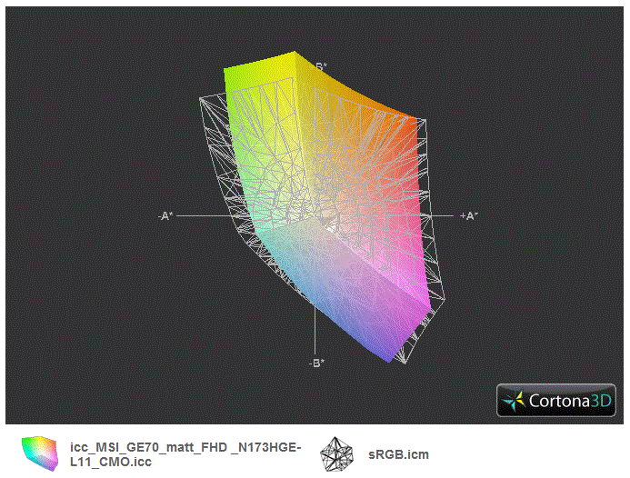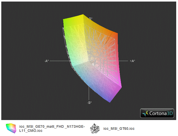 Erfreulich gut fällt die Kontrastmessung aus: 732:1 (MSI GT60: 359:1) Das Chi Mei 173HGE (CMO) liefert damit satte Farben. Die Farbraumabdeckung, wichtig für professionelles DTP (Desktop Publishing, z. B. Druckvorstufe), fällt da schon bescheidener aus: AdobeRGB wird deutlich und sRGB knapp verfehlt. Bei letzterem besteht ein Überhang in den warmen Farben, solche können folglich gut dargestellt werden. Dass sich selbst „Sehr Gute“ Gamer in dieser Hinsicht schwer tun, zeigte das Asus G55V. Die Farbräume sind fast ident (Bild 3). Überraschung im Vergleich mit dem großen Bruder GT60 (LG-Panel; Bild 4): Dessen Farbraum ist deutlich kleiner als beim vorliegenden GE-Modell (CMO-Panel).
