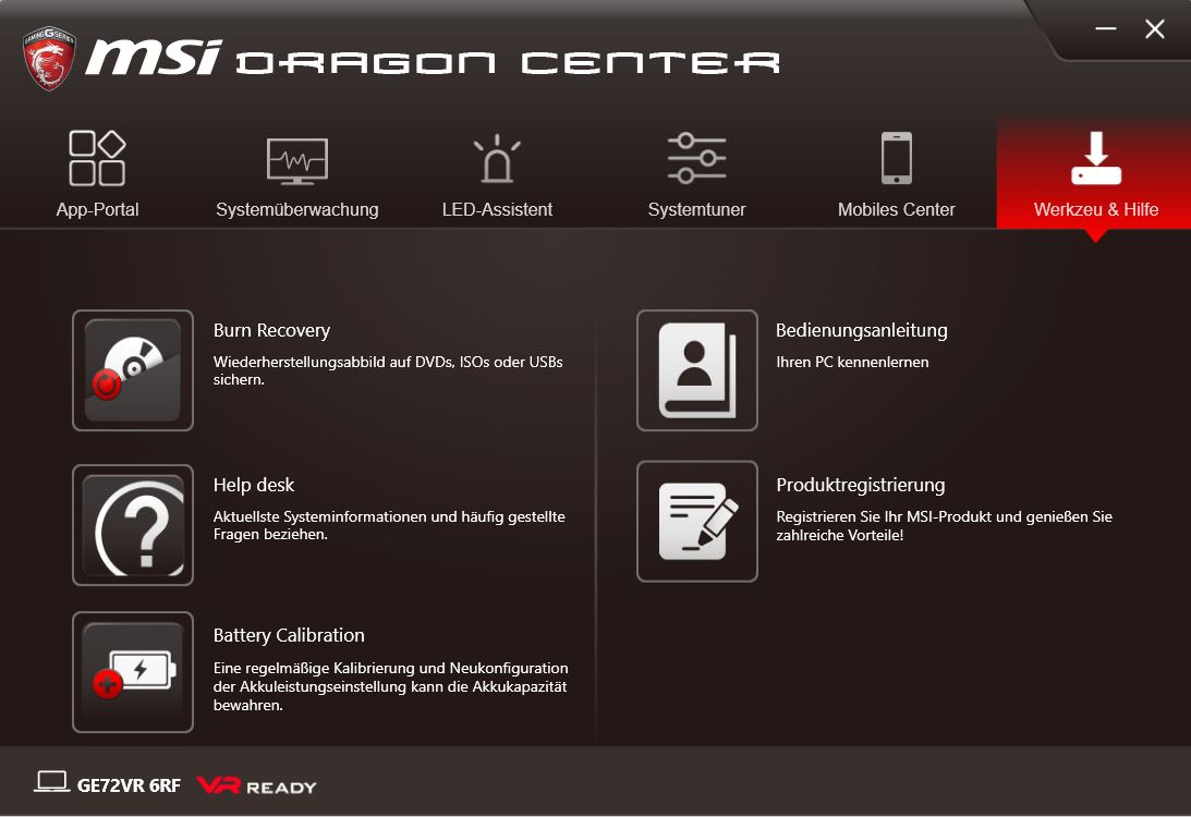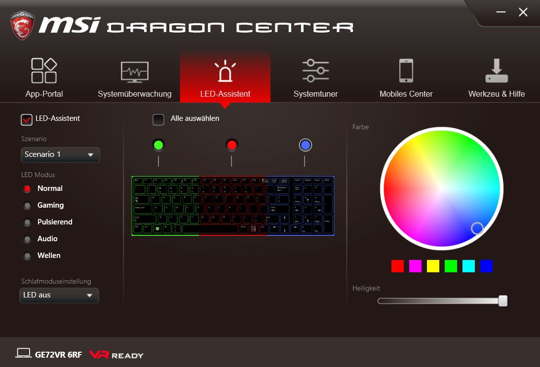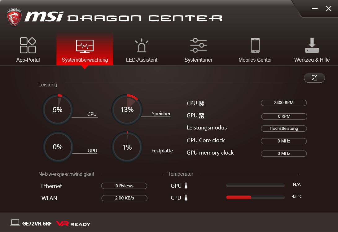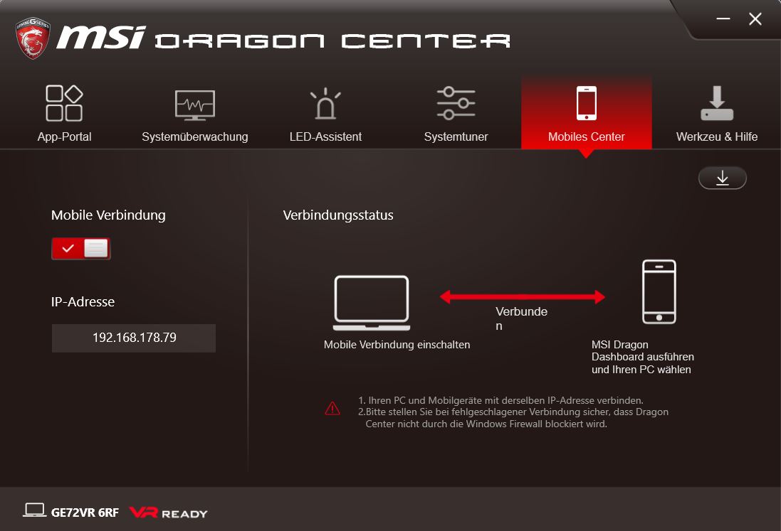 Das MSI Dragon Center ist die Zentrale, um alle relevanten Daten, welche das System betreffen, anzeigen zu lassen. Darüber kann man über dieses Tool diverse Einstellungen tätigen, wie beispielsweise das Anpassen von Tastaturbeleuchtung, Sound oder Display. Teilweise ist dazu im Dragon Center nur die Verknüpfung zu dem passenden Programm hinterlegt (für Sound- und Display-Einstellungen). Die Systemüberwachung gibt dem User einen guten Überblick über den aktuellen Zustand des Systems. Temperatur, Lüfterdrehzahl sowie die Systemauslastung der einzelnen Komponenten sind übersichtlich grafisch dargestellt. Als Besonderheit bietet MSI an, das Laptop mit dem Handy zu koppeln. Die Handy-App funktionierte auf einem iPhone 6 Plus problemlos. Nach kurzer Einrichtung und Verbindung mit dem Notebook lassen sich die Systemdaten auch auf dem Smartphone anzeigen. Auch Systemeinstellungen können über das Handy gemacht werden, allerdings nur in dem Umfang, wie es die Software zulässt.