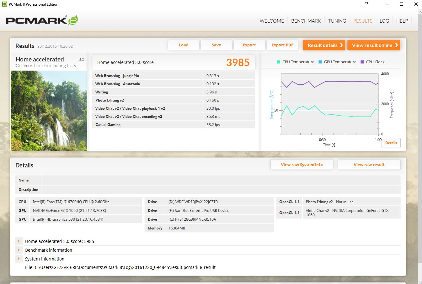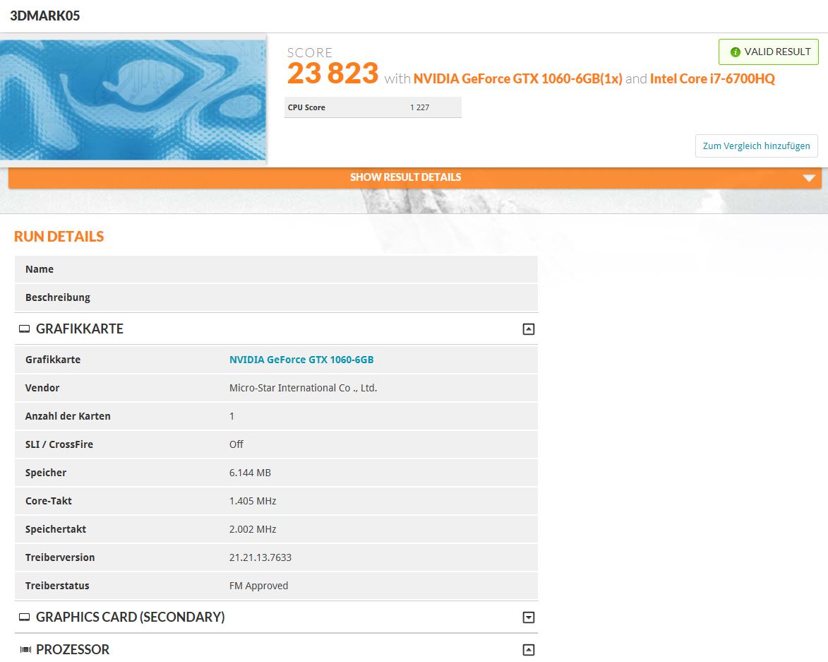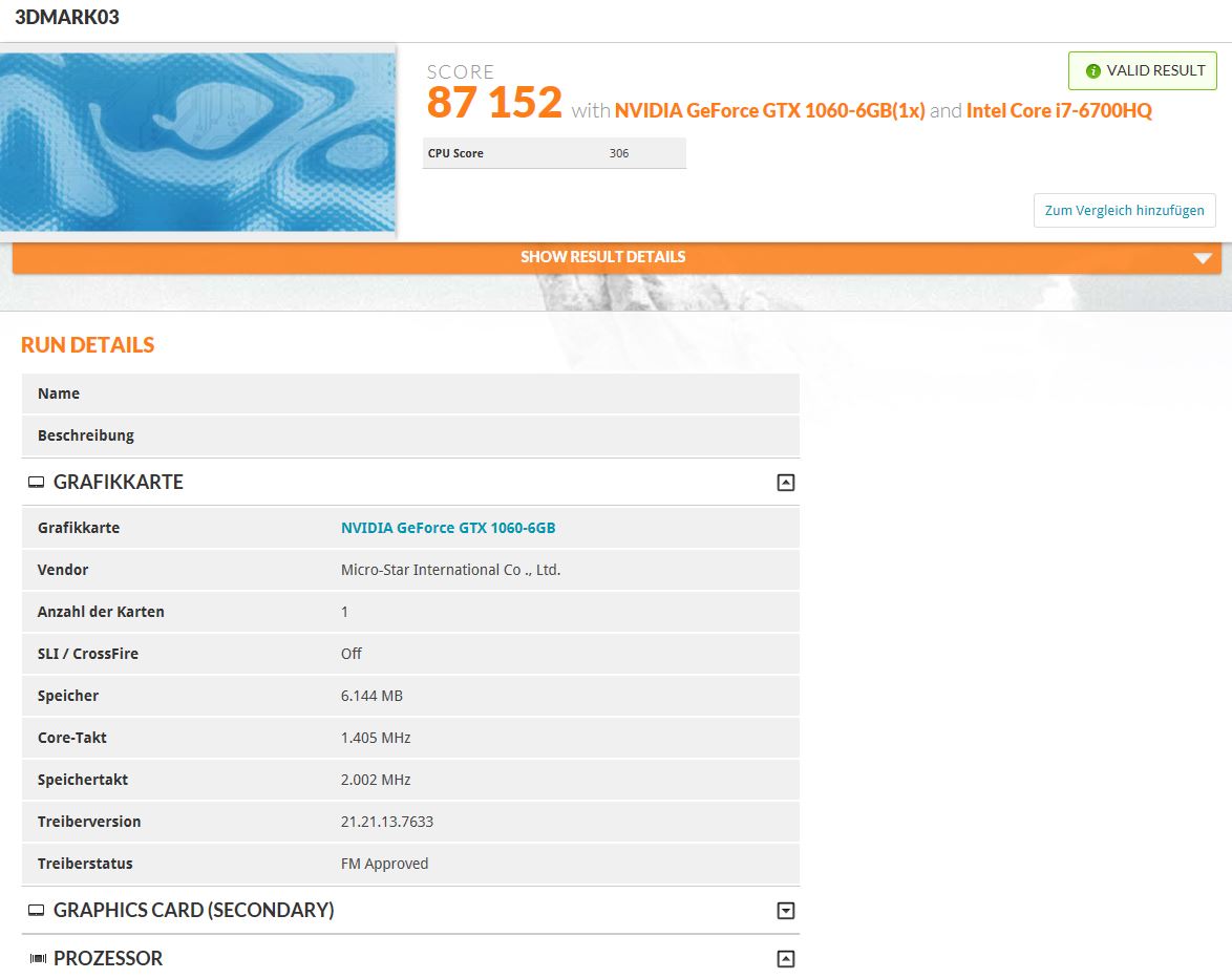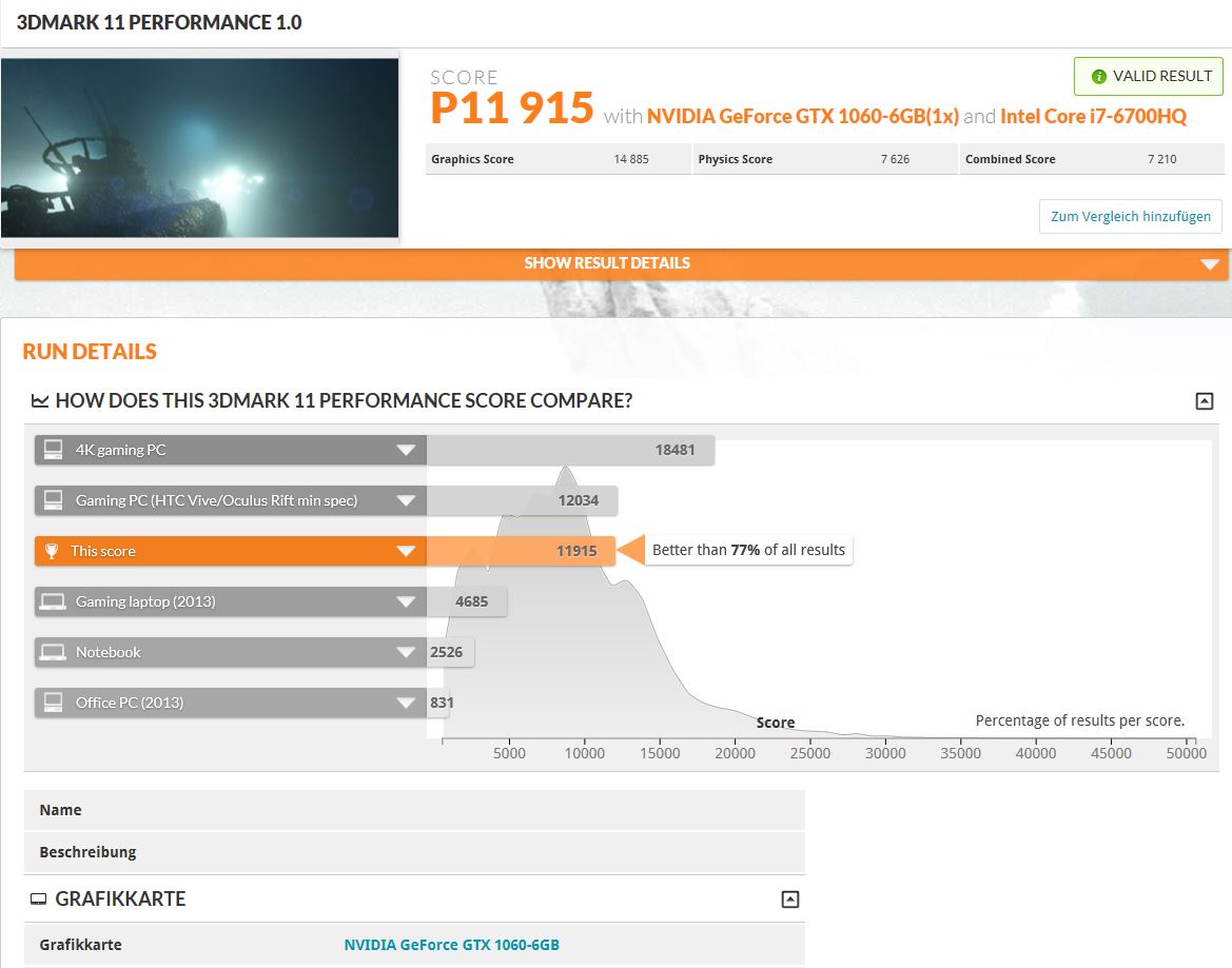 Bei der GeForce GTX 1060 messen wir maximal 85 °C. Unter Volllast, welche wir mit dem Tool Furmark simulieren, taktet die GPU mit ca. 1.200 MHz (schwankend zwischen 1.189 und 1.215 MHz). Aufgrund dieser Beanspruchung ist das Ergebnis beim direkt im Anschluss durchgeführten Benchmark (3DMark 11) rund 500 Punkte schlechter als nach dem Kaltstart.