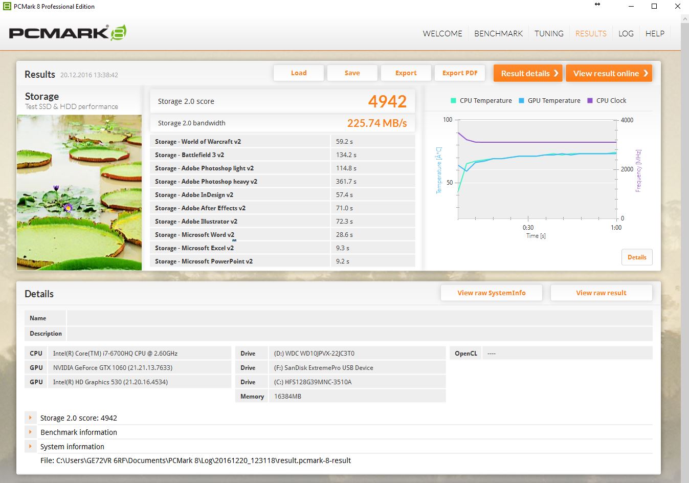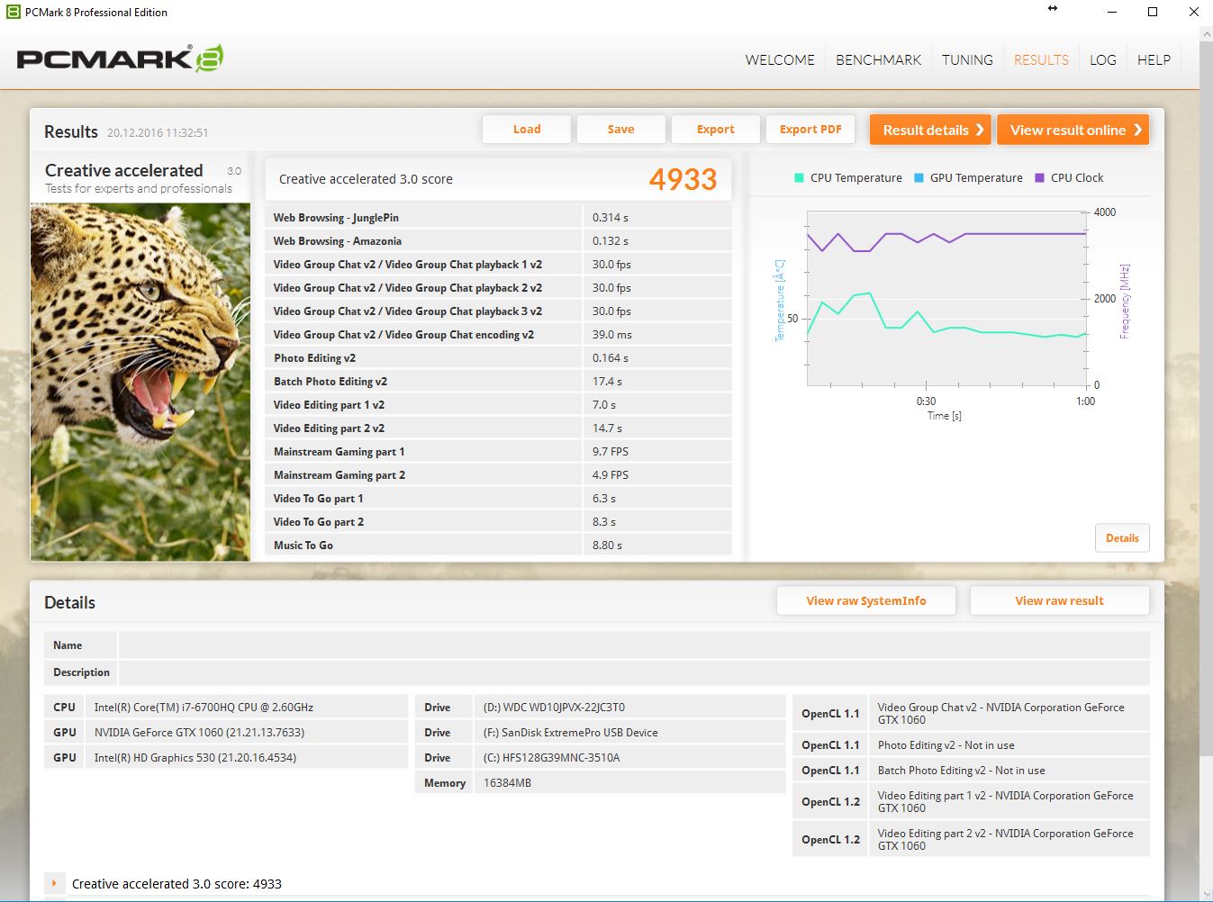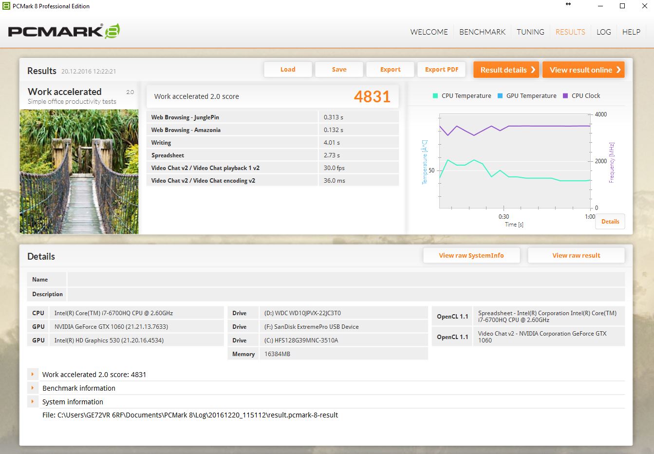 Bei der GeForce GTX 1060 messen wir maximal 85 °C. Unter Volllast, welche wir mit dem Tool Furmark simulieren, taktet die GPU mit ca. 1.200 MHz (schwankend zwischen 1.189 und 1.215 MHz). Aufgrund dieser Beanspruchung ist das Ergebnis beim direkt im Anschluss durchgeführten Benchmark (3DMark 11) rund 500 Punkte schlechter als nach dem Kaltstart.