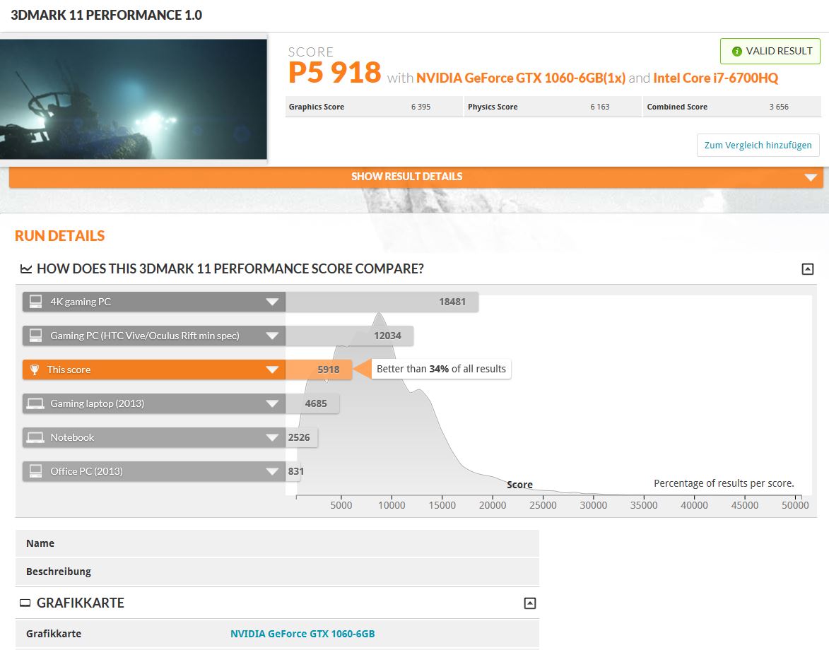Im Akkubetrieb arbeitet die GPU mit gedrosselter Leistung. Beim 3DMark 11 haben wir ohne Netzteil nur noch 5.918 Punkte erreicht.