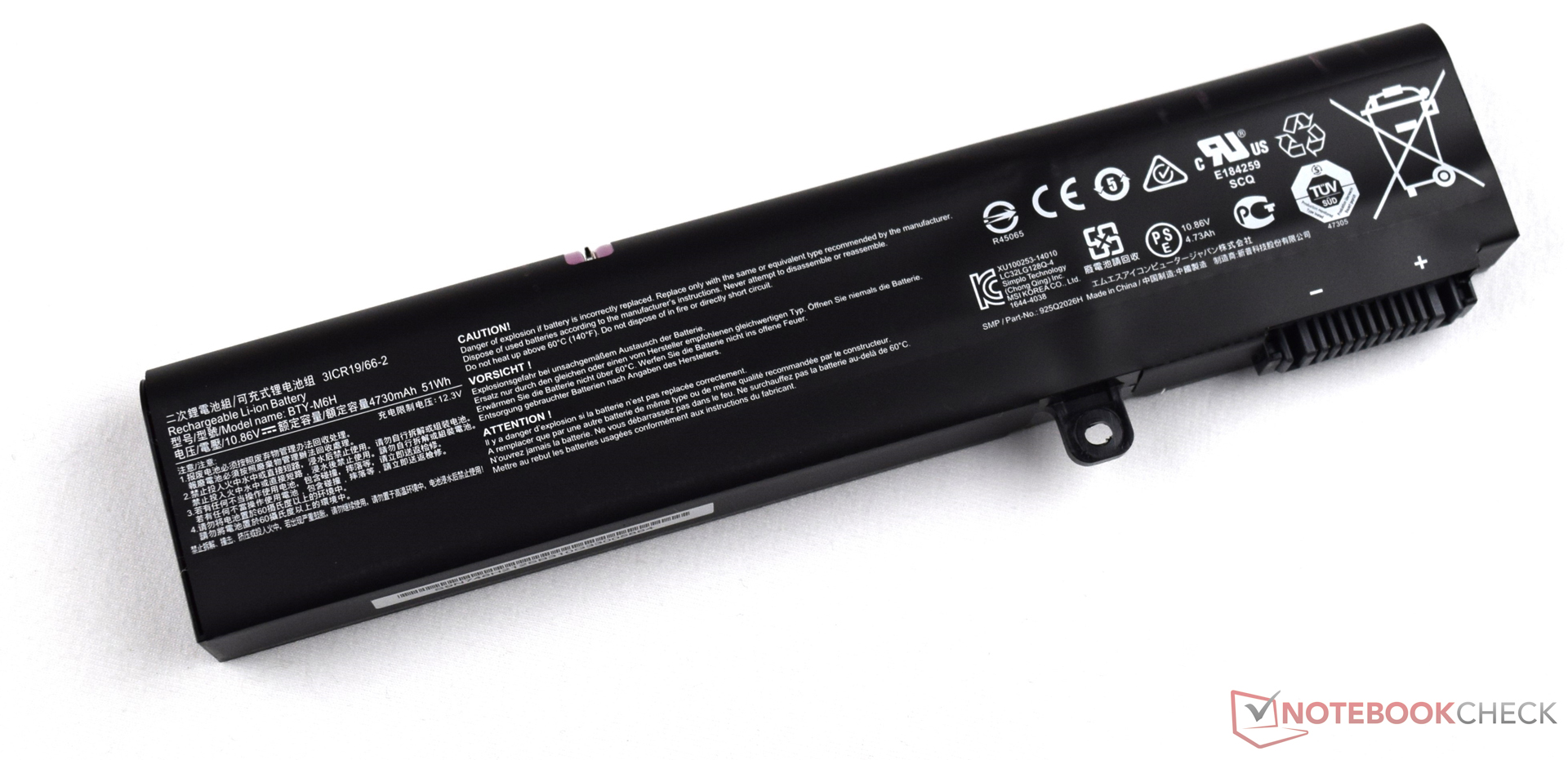Kurz und knapp gesagt sind die Laufzeiten des GE72VR eine Enttäuschung. Der Akku ist im Gerät verbaut und lässt sich erst entfernen, wenn die Bodenplatte abmontiert ist. Der Lithium-Ionen-Akku besitzt eine Kapazität von nur 51 Wh. Damit hat das GE72VR den kleinsten Akku im Testfeld. Eine Ladung reicht im Idle-Betrieb für 3:16 Stunden aus. Unter Last ist schon nach 40 Minuten Schluss, und das Gerät muss wieder aufgeladen werden. Beim praxisnäheren WLAN-Test schafft der 17-Zöller 2:22 Stunden. Obwohl unser Testgerät bei dieser Disziplin nicht glänzen kann, reicht es dennoch für den vorletzten Platz. Das Medion Erazer X7849 hat noch kürzere Laufzeiten.