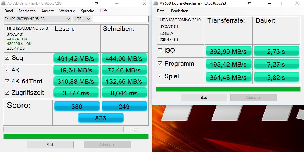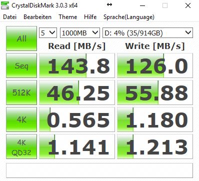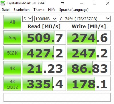 Der SD-Kartenleser, welcher sich auf der rechten Seite vor dem Netzteilanschluss befindet, kann die gängigen Formate SD, SDHC und SDXC verarbeiten. Die Speichermedien verschwinden nicht komplett in dem Schacht und ragen ca. fünf Millimeter aus diesem heraus. Die Performance des Speicherkartenlesers prüfen wir mit unser Referenzkarte (Toshiba Exceria Pro SDXC 64 GB UHS-II). Der Mittelwert beim Kopieren von Bilddateien liegt bei unserem Testgerät bei kläglichen 20 MB/s. Damit lässt sich wahrlich kein Geschwindigkeitsrekord aufstellen. Auch beim sequenziellen Lesetest (mit dem AS SSD Benchmark) ist bei 20 MB/s Schluss. Somit taugt der integrierte Katenleser nur, um gelegentlich ein paar Daten zu übertragen. Sollen allerdings des Öfteren große Datenmengen auf bzw. von einer Speicherkarte übertragen werden, so empfehlen wir Käufern, sich nach einer externen Lösung umzuschauen, welche über USB 3.0 angebunden ist. Dieses Performance-Problem offenbart sich auch bei den Ergebnissen des MSI GS73VR. Acer zeigt mit dem Predator 17, dass es auch anders gehen kann. Im Vergleich ist die Performance um ca. 300 % besser, wenngleich auch die Leistung beim Acer eigentlich Mittelklasse ist. Richtig schnelle SD-Kartenleser können heutzutage problemlos bis zu 200 MB/s übertragen.