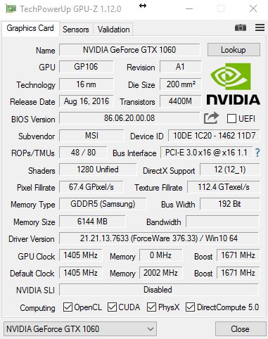 | GPU | Nvidia GeForce GTX 1060 | Nvidia GeForce GTX 1060 | Nvidia GeForce GTX 1070 | Nvidia GeForce GTX 1070 | Nvidia GeForce GTX 1070 | Nvidia GeForce GTX 1070 |