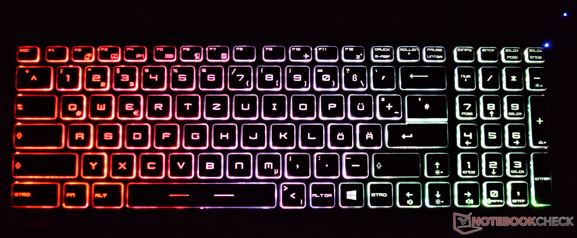 Die SteelSeries Tastatur ist ein alter Bekannter und kommt nun auch beim MSI GE72VR zum Einsatz. Die einzelnen Tasten, welche eine angenehme Größe haben, sind gut in die Oberseite der Base eingearbeitet. Beim Tippen erzeugt die Tastatur keine relevanten Störgeräusche. Der Tastenhub ist angenehm und der Druckpunkt vermittelt ein gutes Feedback, wenngleich dieser etwas straffer sein könnte. Beim GE72VR verzichtet der Hersteller auf Makrotasten, welche seitlich oder oberhalb problemlos Platz gefunden hätten. Die weißen Aufdrucke auf den einzelnen Tasten lassen sich gut ablesen. Allerdings ist zu Beginn etwas Eingewöhnung erforderlich, denn einige Buchstabensymbole weichen vom Standard ab. Bei schlechter oder gar keiner Raumausleuchtung trumpft die SteelSeries Tastatur mit optischen Highlights auf. Über das MSI Dragon Center kann die Beleuchtung der Tastatur nach Belieben in allen RGB-Farben eingestellt werden. Zudem lassen sich auch einzelne Bereiche farblich abgrenzen.