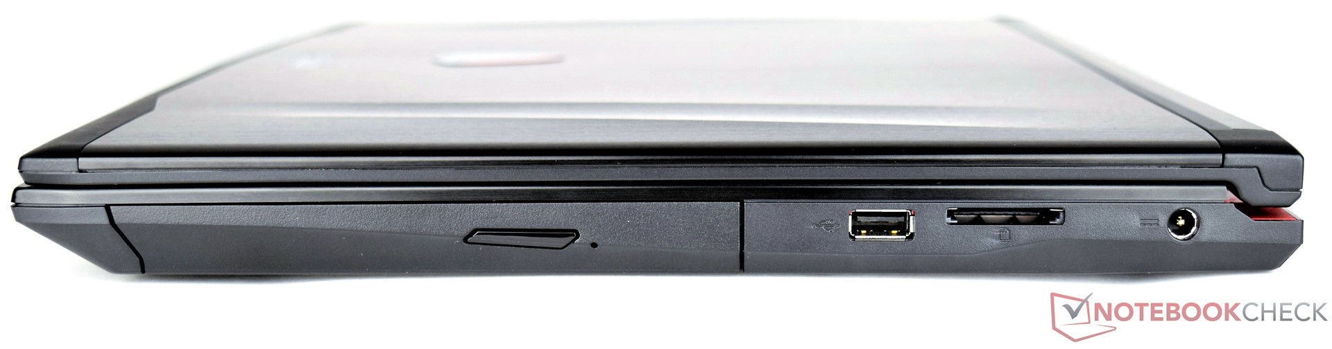 Die externen Schnittstellen, welche das MSI GE72VR zu bieten hat, befinden sich fast ausschließlich auf der linken Seite. Ein Vorteil für Rechtshänder, denn somit bleibt neben dem Gerät genügend Platz, um mit der Maus zu agieren. Positiv ist, dass MSI hier nicht auf ein optisches Laufwerk verzichtet. Dieses findet auf der rechten Seite seinen Platz, direkt neben einem USB-2.0-Anschluss, sowie dem SD-Kartenleser. Auch der Netzteilanschluss befindet sich dort im hinteren Bereich. Hier hat der Hersteller mitgedacht und einen Winkelstecker verbaut, sodass das Kabel im eingesteckten Zustand nach hinten vom Gerät wegführt. Auf der linken Seite befinden sich, wie schon erwähnt, alle restlichen Erweiterungsschnittstellen. Dabei fällt auf, dass zwischen den einzelnen Ports ordentlich Platz herrscht. LAN, USB, HDMI, Mini-DisplayPort und die Audioanschlüsse sind sehr gut auf der ganzen linken Seite verteilt. Von den insgesamt drei USB-Type-A-Anschlüssen besitzt das MSI GE72VR zwei, welche den USB-3.0-Standard unterstützen. Außerdem verfügt der 17-Zöller über einen USB-3.1-Type-C-Gen2-Port. Wir hätten es als zukunftssicher empfunden, wenn MSI dem GE72VR auch Thunderbolt 3 spendiert hätte.