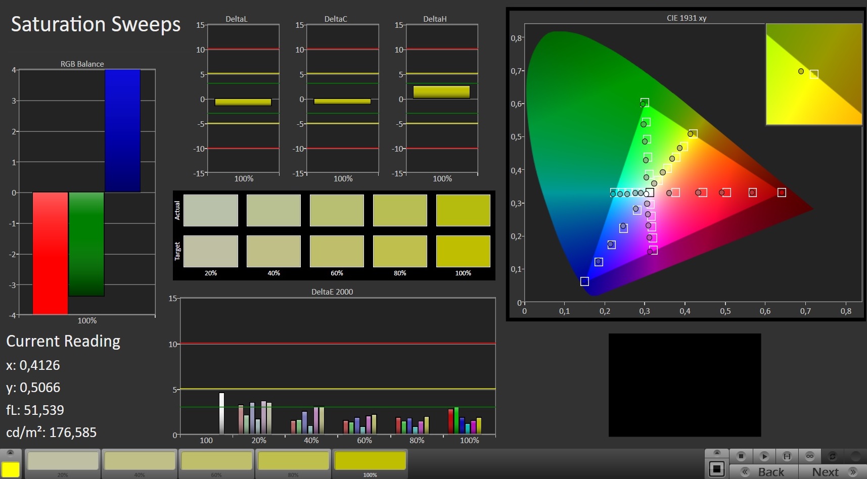 Dass es sich um ein hochwertiges Panel handelt, zeigt sich auch in den weiteren Messungen. Bereits im Werkszustand liegen die Abweichungen der Graustufen und der Farben im Soll und eine Kalibrierung ist prinzipiell nicht nötig. In den Graustufen erkennt man zwar einen minimalen Farbstich in Richtung Blau/Grün, doch ohne einen direkten Vergleich mit einem kalibrierten Monitor fällt das in der Praxis nicht auf. Mit einer Kalibrierung können wir die Ergebnisse noch weiter verbessern und das zugehörige Profil steht weiter oben im Kasten zum kostenlosen Download zur Verfügung.