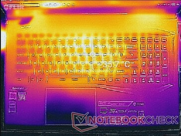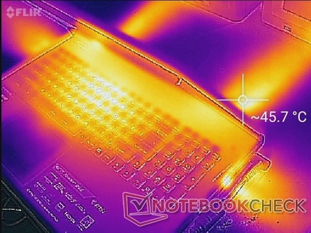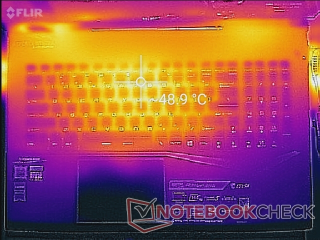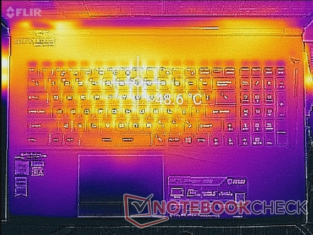 Beim Gamen erwärmt sich die Mitte der Tastatur auf bis zu 49 °C, während das GE75 8SG hier nur 46 °C erreichte. Die Handballenablage, der Ziffernblock und die WASD-Tasten werden dank des Kühlsystems, welches die hintere Hälfte des Gehäuses einnimmt, nie so warm und können somit weiterhin ohne Probleme verwendet werden