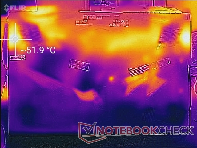 (-) Auf der Unterseite messen wir eine maximalen Wert von 52 °C (im Vergleich zum Durchschnitt von 43.3 °C).
