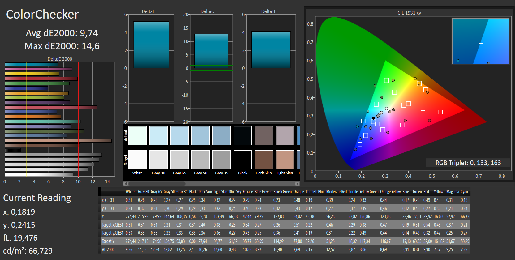 | Colorchecker dE 2000 max. * | 14.6 | 17.12 -17% | 9.78 33% | 12 18% |