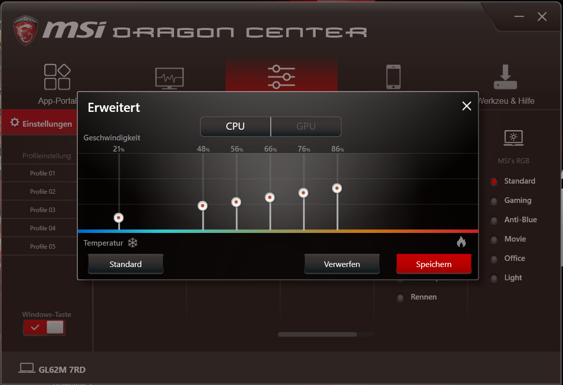 Übermäßig stark erwärmt sich der Rechner nicht. Während des Stresstests wird nur an zwei Messpunkten die 40-°C-Marke überschritten. Wir haben die Lüftersteuerung im Dragon Center auf "Cooler Boost" gesetzt. In der Folge dreht der Lüfter starker auf. Später haben wir den Stresstest noch einmal unter Nutzung der automatischen Lüftersteuerung durchgeführt. Hier fällt die Erwärmung des Rechners um etwa 4 bis 5 °C höher aus. An den gemessenen Arbeitsgeschwindigkeiten von CPU und GPU ändert sich nichts.