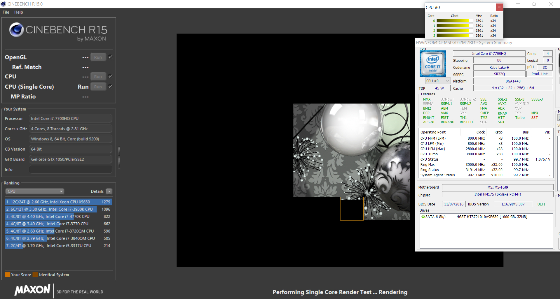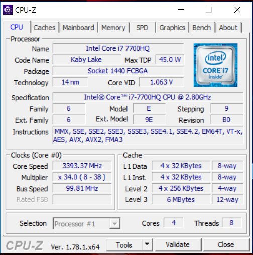 Angetrieben wird das GL62M vom Vierkernprozessor Core i7-7700HQ (Kaby Lake). Die CPU arbeitet mit einer Basisgeschwindigkeit von 2,8 GHz. Per Turbo kann der Takt auf 3,4 GHz (vier Kerne), 3,6 GHz (zwei Kerne) bzw. 3,8 GHz (ein Kern) gesteigert werden. Damit liegen die Taktraten um 200 bis 300 MHz höher als beim direkten Skylake-Vorgänger (Core i7-6700HQ). Die höheren Geschwindigkeiten sorgen für ein besseres Abschneiden innerhalb der von uns durchgeführten Benchmarks. Leistungssteigerungen durch Änderungen an der Architektur treten nicht auf, da sich Kaby Lake und Skylake auf technischer Seite kaum unterscheiden. Gemein ist beiden Prozessoren eine TDP von 45 Watt.