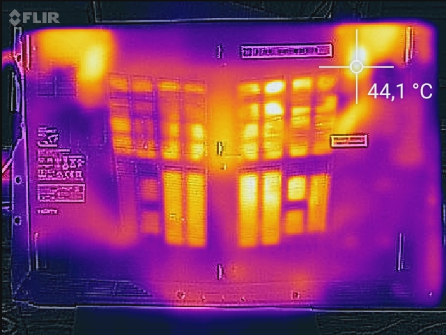 (+) Auf der Unterseite messen wir eine maximalen Wert von 38.2 °C (im Vergleich zum Durchschnitt von 43.3 °C).