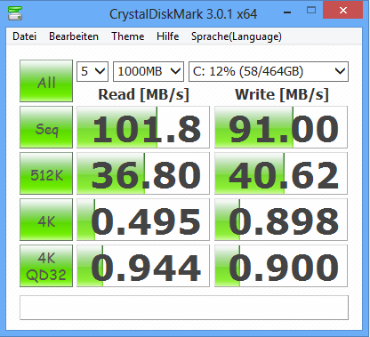 MSI spendiert dem GP60 eine Festplatte aus Hitachis Travelstar Z5K500 Serie. Sie besitzt eine Kapazität von 500 GB und arbeitet mit 5.400 Umdrehungen pro Minute. CrystalDiskMark meldet eine Lesegeschwindigkeit von 101,8 MB/s. HD Tune liefert eine durchschnittliche Transferrate von 78,8 MB/s. Diese Werte gehen für eine 5.400er-Festplatte in Ordnung. Die Zugriffszeit fällt mit 19,9 ms allerdings etwas zu hoch aus.