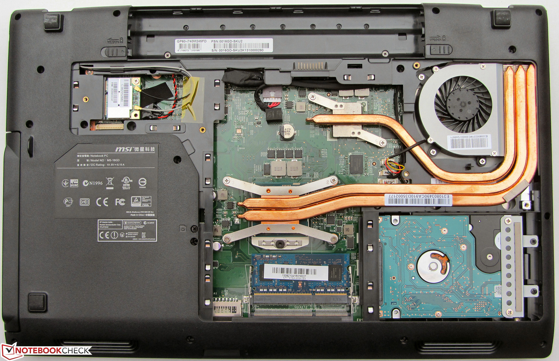 Die große Wartungsklappe ermöglicht den Zugang zum Arbeitsspeicher, zur Festplatte, zum WLAN-Modul, zur BIOS-Batterie, zur CPU und zum Lüfter. Zwei Arbeitsspeicherbänke hält das GP60 bereit. Eine Bank ist mit einem 4-GB-Modul belegt. Ein Tausch der Festplatte ist schnell gemacht. Es können 2,5-Zoll-Festplatten der Bauhöhen 7 und 9,5 mm verwendet werden. Der Lüfter könnte zwecks Reinigung ausgebaut werden. Auch ein Wechsel des Prozessors wäre kein Problem, da er in einem Sockel sitzt. Den im GE60 verbauten mSATA-Steckplatz hat MSI beim GP60 eingespart.