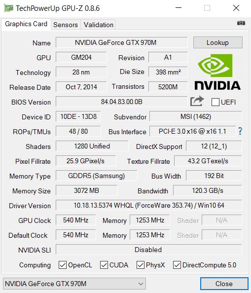 | MSI GS40-6QE16H11 GeForce GTX 970M, 6700HQ | Schenker XMG P406 GeForce GTX 970M, 6700HQ | MSI GS60-6QE4K16H21 GeForce GTX 970M, 6700HQ | Schenker XMG C405 GeForce GTX 965M, 4720HQ | Asus Zenbook UX303UB-R4100T GeForce 940M, 6500U | Alienware 15 R2 (Skylake) GeForce GTX 980M, 6700HQ | |