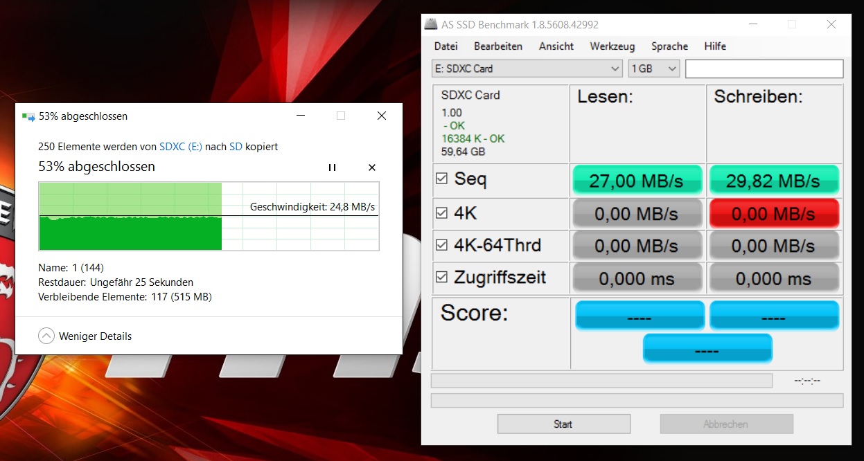 Der Speicherkartenleser ist gähnend langsam. Mit unserer Referenz-Karte (einer Toshiba Exceria Pro SDXC 64 GB UHS-II) messen wir lediglich 25 MB/s im Durchschnitt; das deutet darauf hin, dass irgendwo auf dem Signalweg noch USB-2.0-Technik zum Einsatz kommt. Unsere Messwerte lagen damit noch einmal einige Megabyte unter jenen des Cardreaders, der im neuen GE62 verbaut ist. Bereits dort lautete das Fazit: viel zu wenig in dieser Preisklasse.