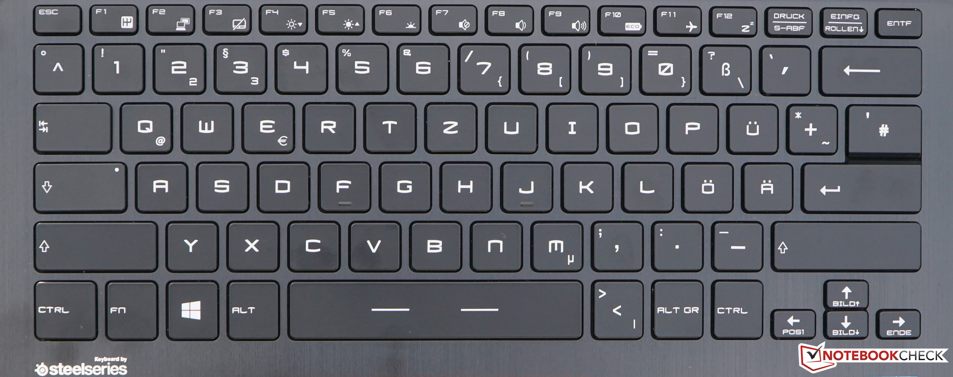 Das GS40 ist mit einer einfarbig rot hintergrundbeleuchteten Tastatur von SteelSeries ausgestattet. Sie ist vom Aufbau her den Keyboards der größeren MSI-Gamer ähnlich, wenn man vom Nummernblock absieht, der hier aus Platzgründen fehlt. Das Tippgefühl entspricht aber leider nicht ganz der gewohnten Qualität. Tastendruckpunkt und Hub sind zwar sehr gut gewählt; die gesamte Tastatur biegt sich jedoch schon bei leichtem Druck auf einzelne Tasten durch. Diese ungewollte Federung ergibt ein insgesamt recht schwammiges Tippgefühl.