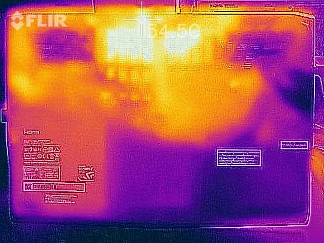 (-) Auf der Unterseite messen wir eine maximalen Wert von 63.2 °C (im Vergleich zum Durchschnitt von 43.3 °C).