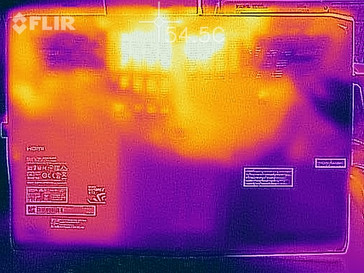 Auf der rechten Seite der Handballenauflage (HDD) und oberhalb der ersten Tastaturreihe (CPU) werden die Oberflächen spürbar wärmer. Im Bereich des Prozessors messen wir bis zu 63 °C unter voller Last, während das größere GT72VR nur bei 54 °C liegt. Beim Spielen bleibt das GS43VR mit maximal 54 °C etwas kühler. Interessanterweise bleibt die Handballenauflage unter voller Last sogar kühler als im Leerlauf, da die frische Luft über die Lautsprechergitter angezogen wird. Die wichtigen WASD-Tasten werden niemals unangenehm warm, was für ein 14-Zoll-Gaming-Notebook eine gute Leistung ist.