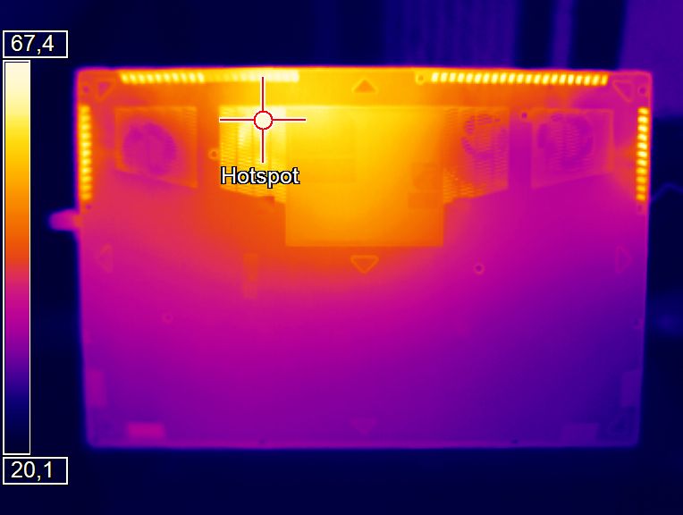 (-) Auf der Unterseite messen wir eine maximalen Wert von 63 °C (im Vergleich zum Durchschnitt von 43.3 °C).