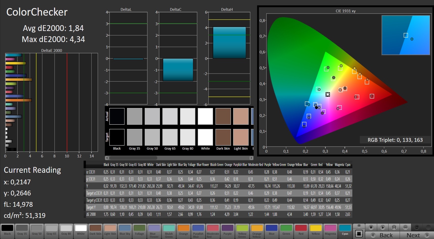 | Delta E Colorchecker * | 2.37 | 3 -27% | 1.29 46% | 5.74 -142% | 5.52 -133% |