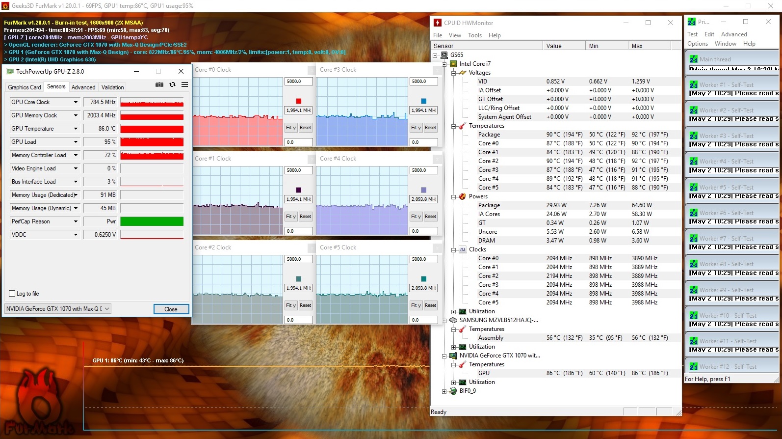 Wagen wir kurz einen Blick ins Innere des Gehäuses, der leider nicht optimal ausfällt. Während das Gigabyte Aero 15X zu keiner Zeit throttelt, brechen der CPU- und GPU-Takt des GS65 im Stresstest mit den Tools Furmark und Prime95 unter den Basiswert ein – und das bei vergleichbaren Hardware-Temperaturen. Rund 86 °C für die GeForce GTX 1070 Max-Q und 90 °C für den Core i7-8750H sind recht viel. Im Spielealltag tritt – wie bereits erläutert – zum Glück keine Drosselung auf.