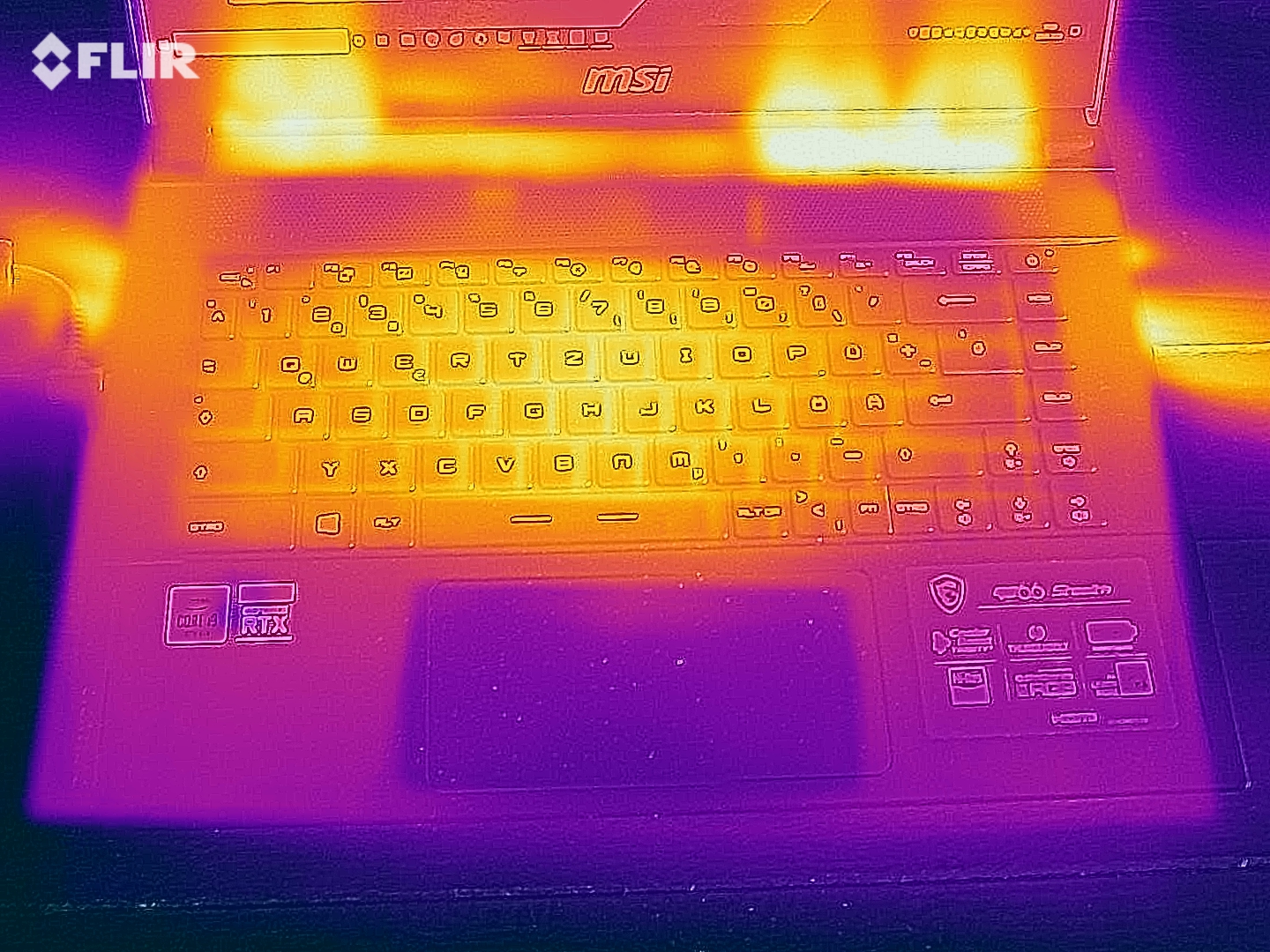 Die Temperaturen sind typisch für ein derart flaches High-End-Notebook. Während die Baseunit im 3D-Betrieb bis zu 53 °C (oben) bzw. 55 °C (unten) erreicht, bleibt das Gehäuse im Leerlauf kühler als 30 °C. Das Urteil zu den Komponenten fällt zwiespältig aus. Auf der positiven Seite wäre die RTX 2070 Super Max-Q zu nennen, welche selbst unter Volllast (Furmark & Prime95) maximal 75 °C erreicht.