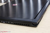 Abgesehen von einigen Schwachstellen ist die Gehäusequalität ebenso sehr gut. Sowohl für den Innenrahmen als auch zwischen den beiden Scharnieren kommt Kunststoff zum Einsatz. Der Bildschirmdeckel ist etwas anfälliger auf Verwindungskräfte und Druck gegen den zentralen Bereich als viele seiner dickeren 17-Zoll-Kollegen. Die Basis aus gebürstetem Metall und der zentrale Tastaturbereich geben unter mäßiger Kraftanwendung sichtbar nach, was wahrscheinlich daran liegt, dass für solch ein Design dünnes Material notwendig ist. Ansonsten ist die Basiseinheit bei nur sehr leisem Knarren verwindungsresistent, und die Scharniere sind ausreichend fest, um ein Wippen des Bildschirms beim Tippen oder Gaming zu verhindern.