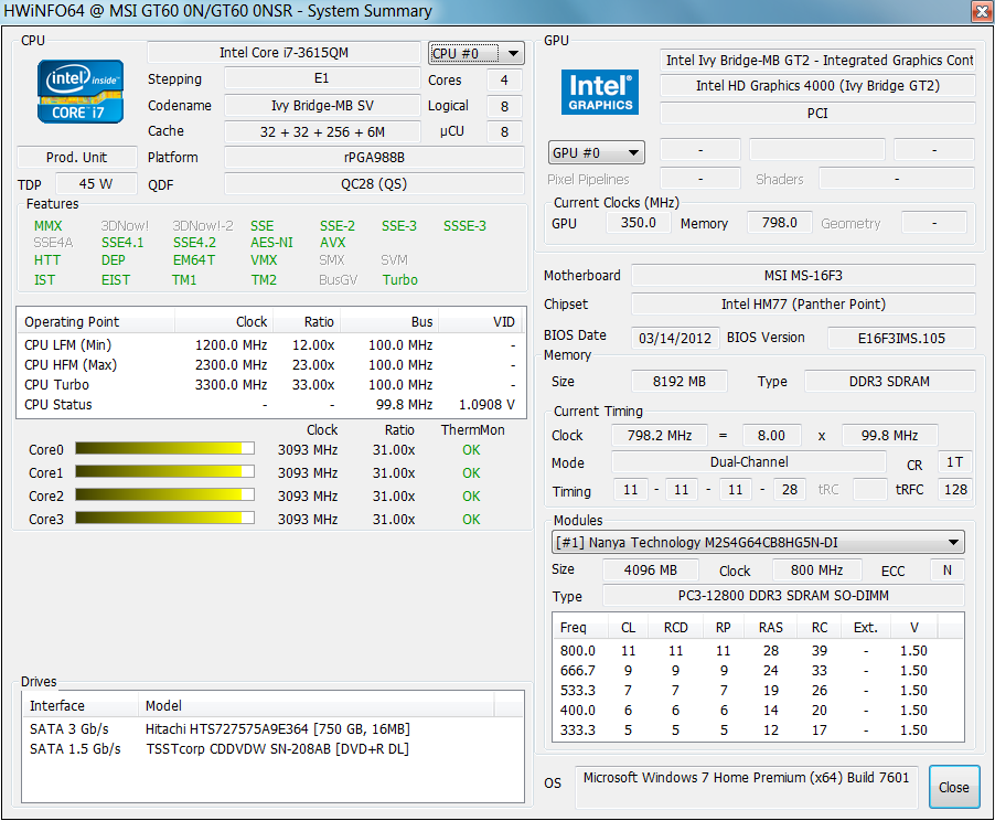 Das GT60-i789W7H verbindet die Quadcore-CPU Intel Core i7 3610QM mit der Oberklasse-Grafikkarte GeForce GTX 670M von Nvidia. Weiterhin sind eine 750 GB Festplatte und 8 GB Arbeitsspeicher integriert. Als Besonderheit wirbt MSI für die Übertaktung der Grafikkarte per Knopfdruck, die im Spiel den entscheidenden Vorteil bringen soll.