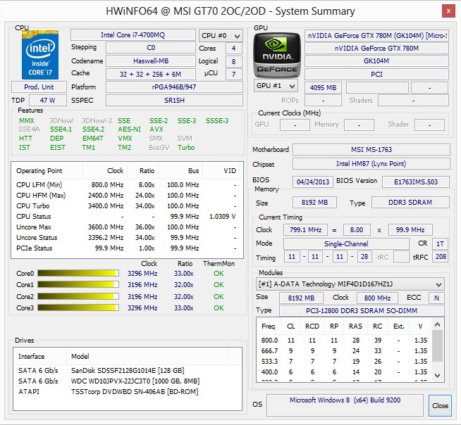 Richtig interessant wird es allerdings erst beim GT70H-80M4811B, welches uns MSI zum Test geschickt hat und das aktuell für rund 2.000 Euro über die Ladentheke wandert. Neben acht GByte DDR3-RAM, einem Blu-ray-Laufwerk und einer Kombination aus 128 GByte kleiner mSATA-SSD und 1.000 GByte großer HDD ist eine GeForce GTX 780M an Bord. Nvidias neues Topmodell richtet sich an anspruchsvolle Gaming-Enthusiasten. Als Prozessor kommt wiederum der Core i7-4700QM zum Einsatz.