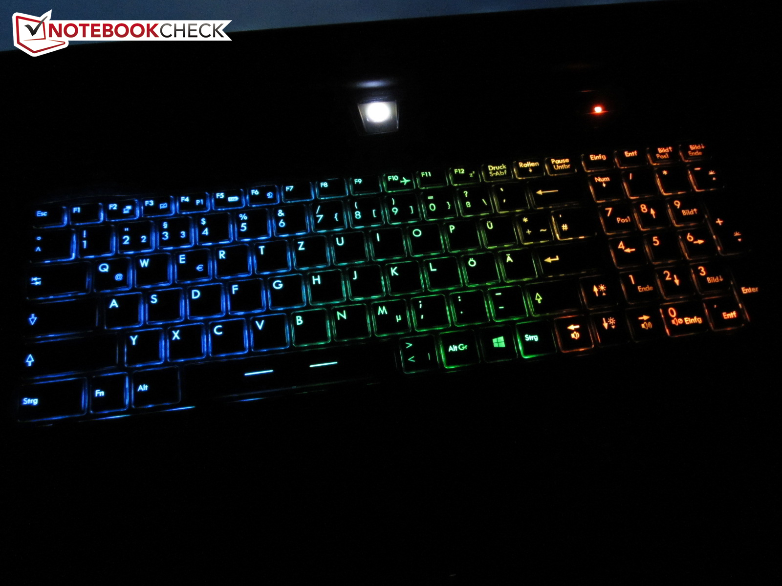 Wie der Vorgänger bietet das Notebook eine regelbare 3-Zonen-Beleuchtung, deren Farbe sich manuell anpassen lässt. Die einfach zu bedienende Software hält auch mehrere Spezialmodi wie »Wave« oder »Breathing« parat. Schade allerdings, dass die Beleuchtung nicht 100 % gleichmäßig ist (die linke Pfeiltaste strahlt etwas heller als der Rest).