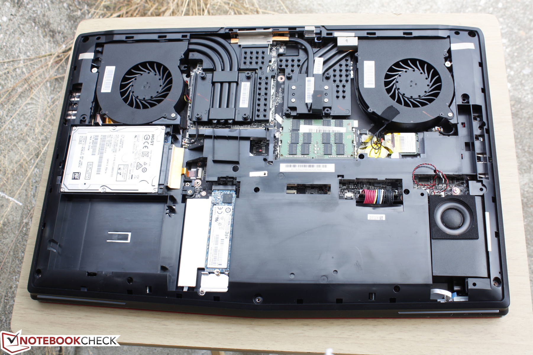 Der Nachteil eines solch stabilen, wartungsfreundlichen und gut ausgestatteten Notebooks ist die Größe: Mit 48 Millimetern ist das GT72VR nach wie vor eines der dicksten Gaming Notebooks in dieser Größenklasse. Selbst das Eurocom DLX7 mit seinem Desktop-Prozessor (Skylake) und das GTX 980 ist dünner, dafür jedoch einige hundert Gramm schwerer. In der Tat fühlt sich das GT72 auch nicht so massiv an wie einige andere Konkurrenten. Das wird auch von dem Blick auf den inneren Aufbau bestätigt, denn zwischen der unteren Abdeckung und den Komponenten gibt es noch etwas Luft.