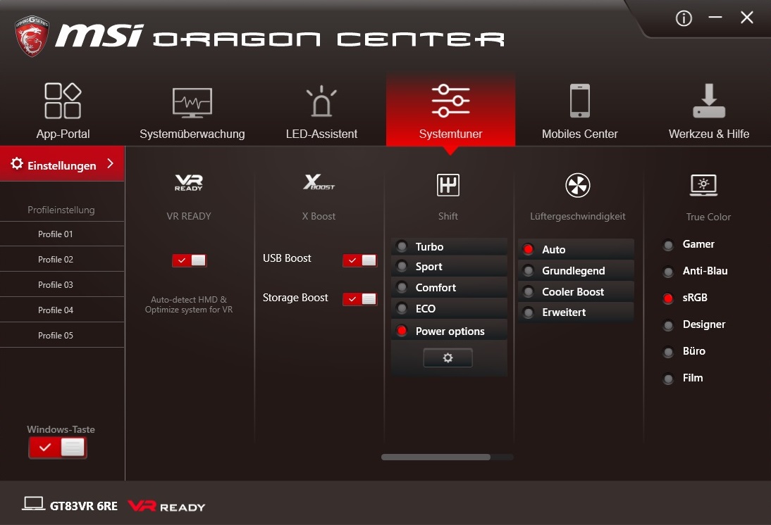 Apropos Software: MSI installiert wie üblich jede Menge Tools und Programme auf dem System. Abseits von CyberLinks PowerDVD 12, der Magix-Suite und der 1-Jahres-Lizenz für den XSplit Gamecaster, welche eher nette Gimmicks sind, sollte man unbedingt einen Blick auf das Dragon Center, oder genauer gesagt, das Menü Systemtuner werfen. Hier sind vor allem zwei Features interessant. Während der Punkt Lüftergeschwindigkeit selbsterklärend ist (manuelle Steuerung möglich!), wirkt sich der Shift-Modus auf die Energiespar-Optionen und das Taktverhalten aus.