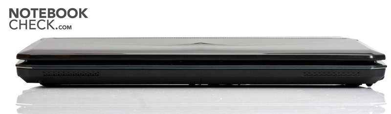 An der Front befinden sich keine weiteren Anschlüsse, während sich auf der Rückseite noch ein VGA Ausgang, ein HDMI Ausgang, ein eSATA Anschluss, der RJ45 Netwerkanschluss, der Anschluss für das Netzteil und ein Kensington Anschluss befinden. Die Positionierung der Anschlüsse auf der Rückseite ist möglich gewesen, da sich der Akku an einer anderen Stelle befindet und somit die Rückseite freigegeben hat. Ein Pluspunkt ist die Position der Anschlüsse auf der Rückseite gerade wenn das GX660R längere Zeit stationär eingesetzt wird. Dadurch dass die Kabel für Monitor, externe Festplatte und Strom hinten herausgeführt werden können, vermindert man den Kabelsalat der auftreten würde wenn die ganzen Kabel seitlich im Notebook stecken würden.