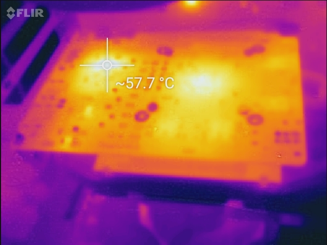 Die gemessenen Temperaturen sind intern und extern ohne Makel. Wir messen maximal 57 °C an der Außenseite nach mehr als 1 h starker Last, und auch intern meldet die GPU in unseren Tests maximal 57 °C. Beide Werte absolut unkritisch. Im Idle fällt die Temperatur dank 202 MHz GPU- und Speichertakt sehr schnell auf kühle 23 °C.