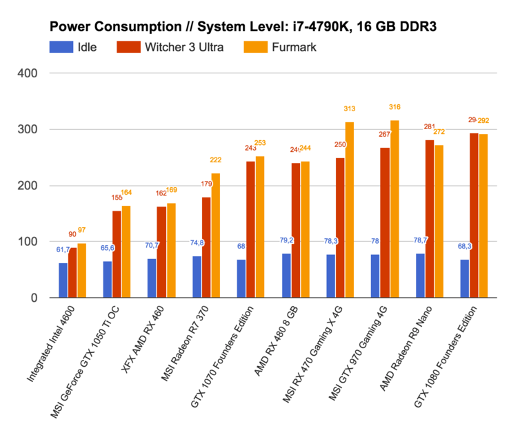 Beim Stromverbrauch kann die MSI GeForce GTX 1050 Ti OC klar punkten. Im Idle stellt sie einen neuen Bestwert in unserem Testsystem auf und ist nur 4 Watt stromhungriger als die integrierte Intel Grafikkarte in der CPU. Auch unter Last sind die Messwerte sehr gut, die Effizienz im Furmark Test ist mit den gemessenen 0,43 fps/Watt (durch die starke Reduzierung der Taktrate) nur auf Niveau einer GTX 970 (0,43) bzw RX 470 (0,42) und nicht vergleichbar mit den großen GTX 1070 (0,77 fps/Watt) oder 1080 (0,7) Modellen.