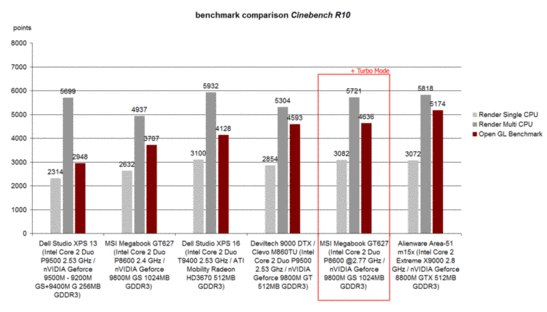 Überaus interessant fällt der Einfluss der Turbofunktion auch im Cinebench R10 Benchmarktest aus. Diese kann beispielsweise im Single Core Rendering einen Leistungsvorteil von 17% und im Multi Core Rendering Test ein Plus von 16% herausfahren. Gleichzeitig überraschend als auch beeindruckend fällt allerdings die Performance im OpenGL Shading Test aus. Mit erreichten 4636 Punkten kann das MSI GT627 mit Turbo um ganze 25% zulegen.