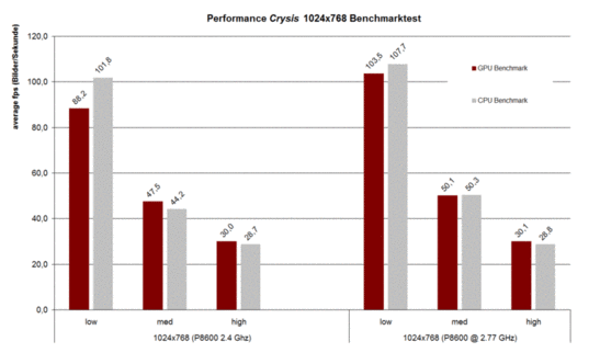 High Details möglich oder nicht, das ist meist die Frage bei leistungsfähigen Systemen im Test mit dem Shooter Crysis. Dies gilt natürlich auch für das MSI Megabook GT627. Im durchgeführten Spielintegrierten Benchmarktest bestätigt sich das Ergebnis von Call of Duty IV. Der Einfluss der übertakteten CPU verschwindet hier ebenso mit dem ansteigen der Grafikanforderungen.