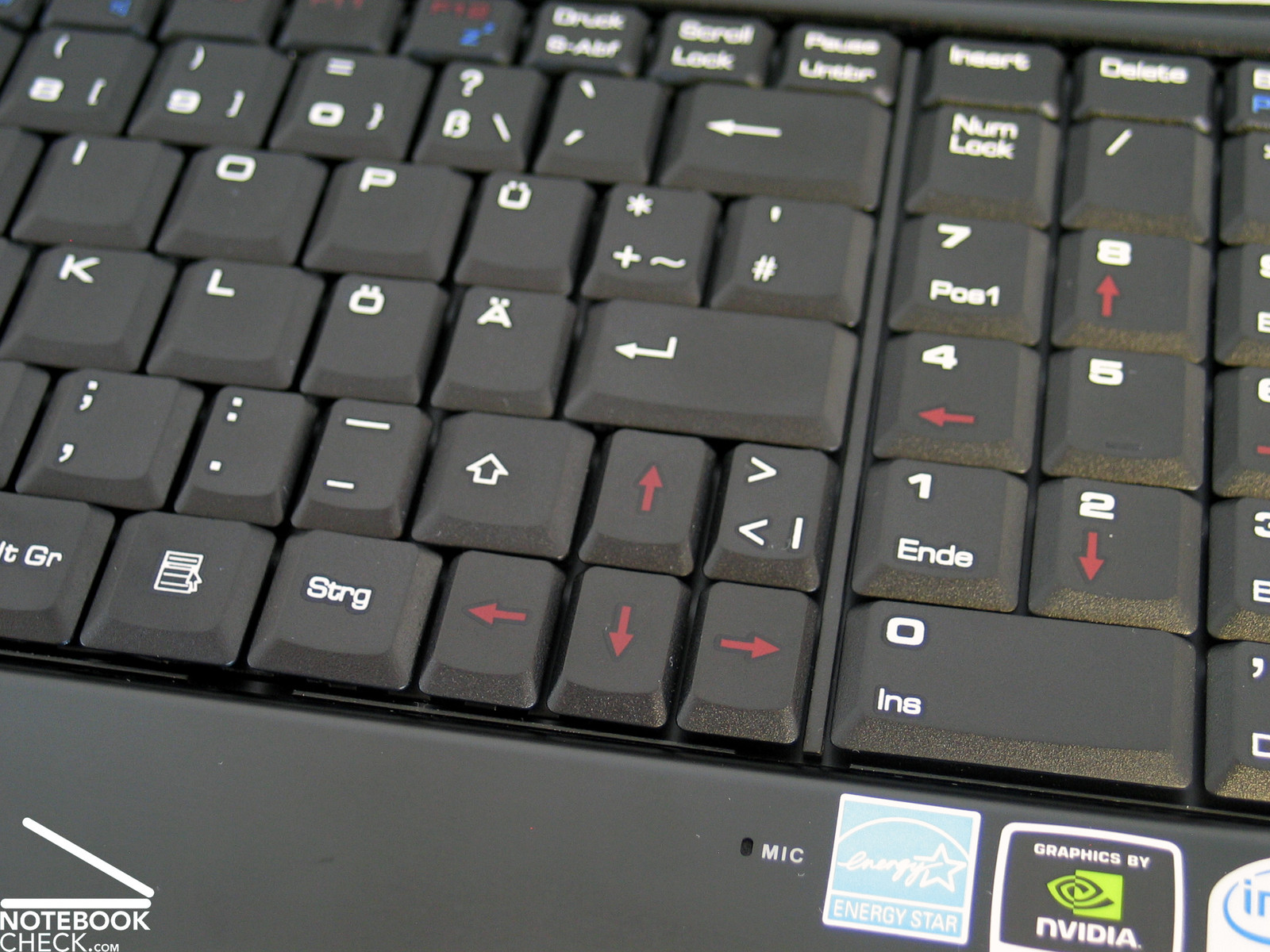Wie dem auch sei, durch den roten Aufdruck der Cursor-Pfeile sowohl beim Nummernblock als auch bei den üblichen, im Falle des MSI 627 doch sehr stark verkleinerten Pfeiltasten, sowie im Bereich der A-W-S-D Tasten, versucht MSI den Gaming-Nutzen des Tastenlayouts zu unterstreichen.