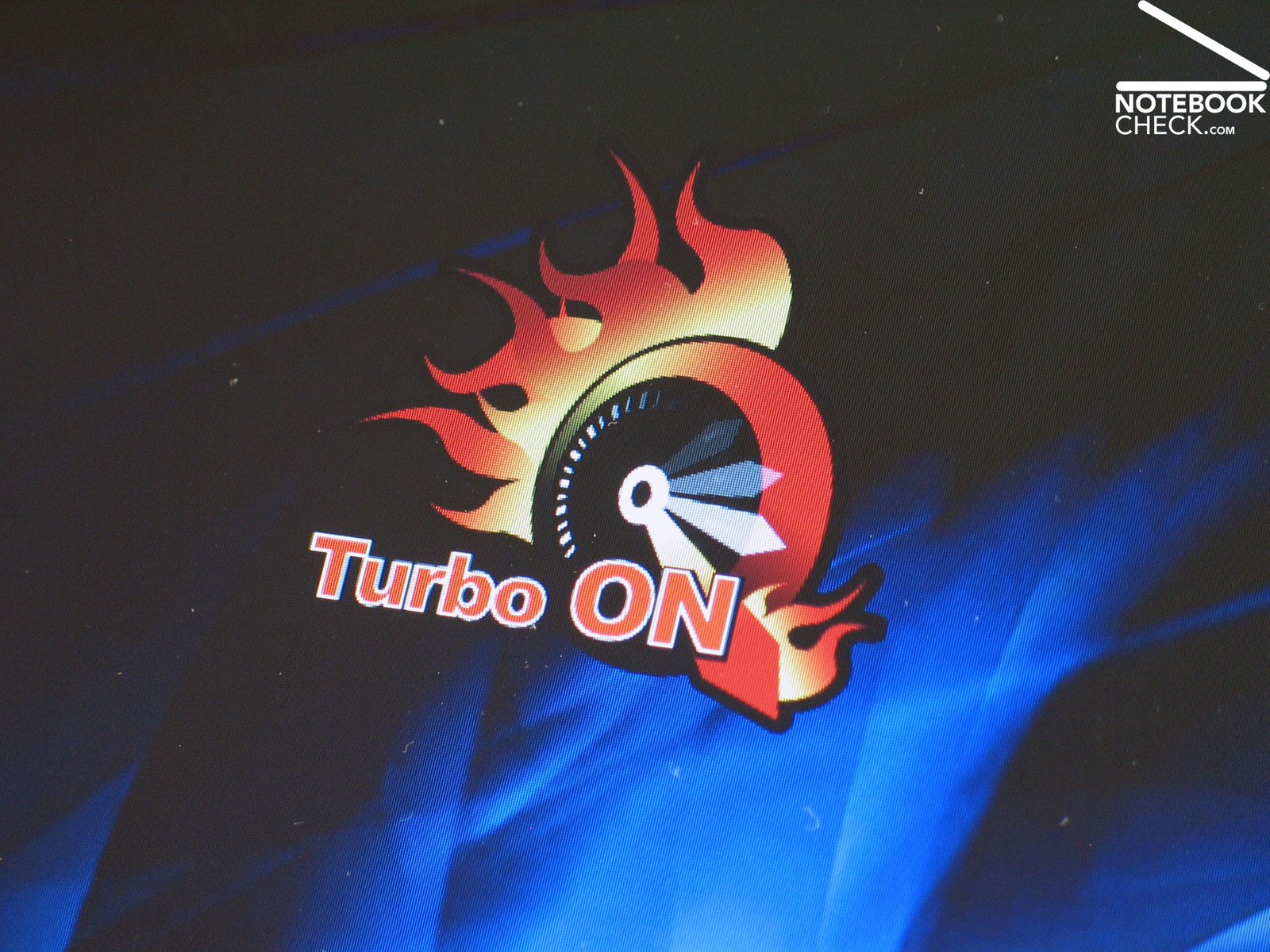 Der „Turbo-Button“ oberhalb der Tastatur erhöht die Taktung der CPU auf 2.77 GHz, das entspricht einem Zuwachs von rund 15%. Da durch die höhere Taktung des Chips nicht nur der Stromverbrauch, sondern auch die Abwärme sprunghaft ansteigt, ist unter Last kurz nach Aktivierung des Turbomodus auch eine Zunahme der Lüftergeschwindigkeit zu beobachten.